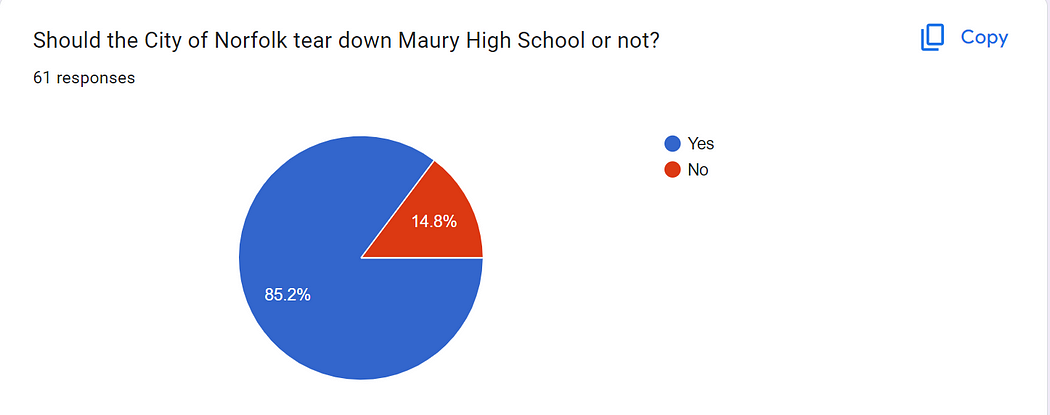 Our surveys from October 2023 state that roughly 85 percent of Maury staff and 92 percent of Maury students believe the building should be rebuilt.